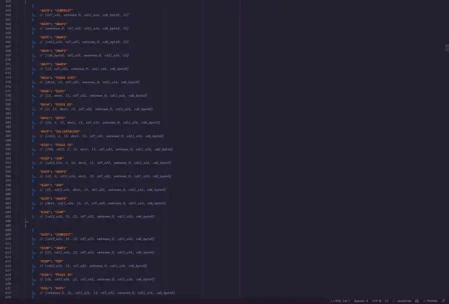 到目前为止,进展非常有限,所以让我们试试 Python。我们将逐块分解代码,按 jumpdest、jumpi、jump、stop、revert 和 invalid 进行划分。现在我们先把这些内容写入文件,然后开始添加一些堆栈注释,希望能找到突破口。