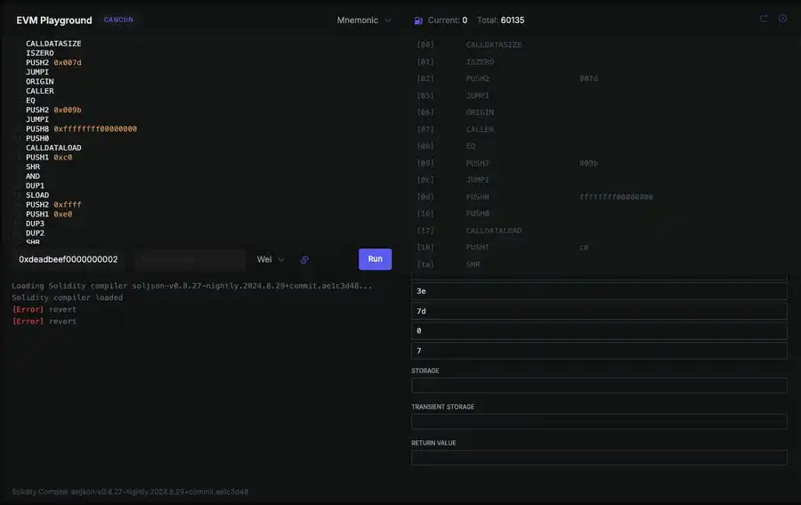 我之前对 EVM dot codes 给予了很多好评(现在依然如此)。它包含了每个 EVM 操作码的信息(如果你想深入研究,建议每一个都读一遍,每一个),并且还有一个可以测试操作码的 playground。让我们试试将字节码和 calldata **去,逐步执行我们之前提到的交易。
