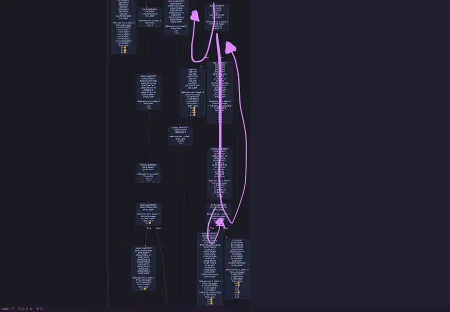 其次,有大量循环。有些循环仅在特定的 calldata 字节具有特定值时发生,另一些是上面提到的那些动态跳转的结果,似乎有多达十个这样的动态跳转。有些循环很短,而另一些几乎贯穿整个合约。也许我有些阴谋论,但其中一些可能只是「蜜罐」(honey pots)。