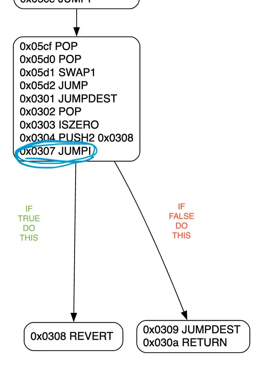 jumpi 指令是条件跳转指令,它告诉 EVM(以太坊虚拟机)「如果」某个条件为非零,则「跳转」到另一处代码继续执行,否则就像什么都没发生一样继续执行下去。通常,这会显示为一个块指向两个其他块,一个代表「为真」条件,另一个代表「为假」条件,类似于以下情况。