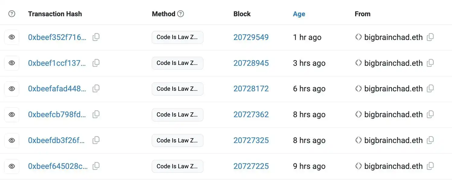 Bigbrainchad.eth 是一个运行 MEV 合约的账户,其中每笔交易哈希都以 0xbeef 开头,每个函数调用以 codeIsLaw 开头,每个交易输入以 0xdeadbeef 开头。高层来看,它是一个多调用者(multicaller)。但在底层,代码的复杂性与艺术表现相结合,形成了我所见过最复杂的代码混淆之一。