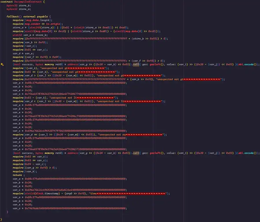 前四个字节是装饰性的,合约会忽略它们。此前对该合约的调用实际上使用的是全零 0x00000000,因此在效率**化的过程中逐渐加入了一些风格化的元素。接下来的两个字节对应的是前面提到的时间戳控制流;这很可能是为了确保交易只会在预期的区块和预期的时间戳内被包含。再接下来的一个字节与我之前提到的控制流蜜罐有关;也许它有更重要的用途,但堆栈太深,我也有些累了。随后还有一些未知字节。