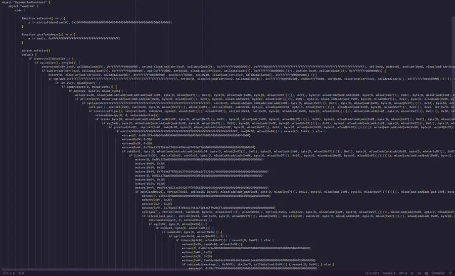 这么简单吗?没那么容易,字符串中混入了一些空字节,这可能是 bigbrainchad 的疏忽,写了太多汇编代码。我们再深入一层,看看 Yul。