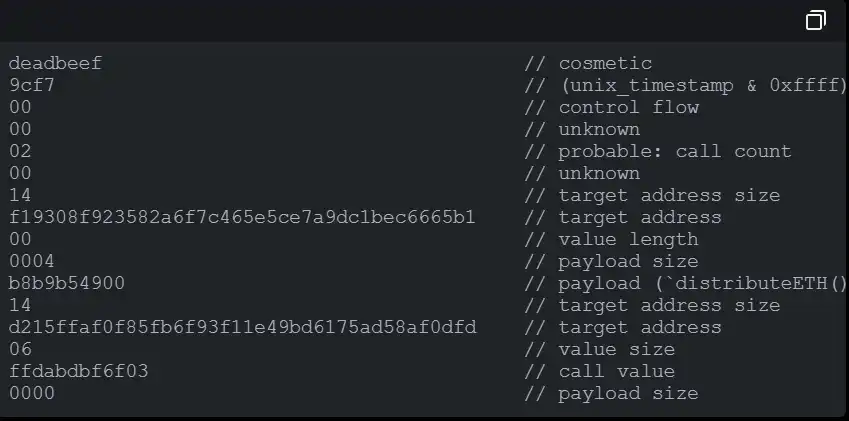 真正有趣的是「目标地址大小」参数。对于调用的目标地址、值和负载,每个都有一个前缀大小。它们使用一个字节表示目标地址和值的大小,并使用两个字节表示负载的大小。系列中的**个调用是针对 0xf193..65b1,值为零,负载为 0xb8b9b54900,即 distributeETH()。系列中的第二个调用是针对 0xd215..0dfd,即 bigbrainchad.eth,值为 281314951393027 wei,且没有 calldata。