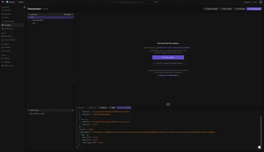 Tenderly 提供了一些交易跟踪信息,并且在过去的漏洞恢复和响应中起到了关键作用。让我们看看是否能通过它对这个程序的运行方式获得有意义的洞察。我们将使用以下交易哈希:0xbeef0ad930c2f0052758ce9ce579ad7f83bed913ffedb50046c3c674293d1fe5