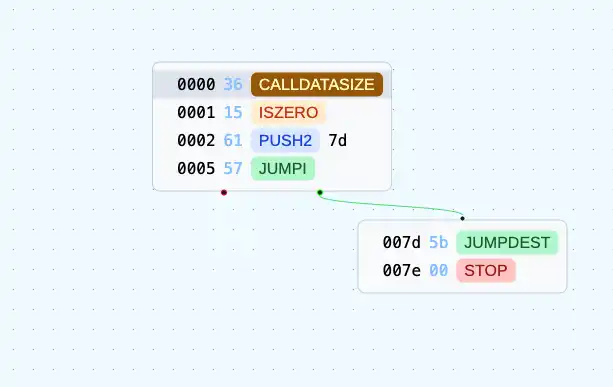 这意味着所有的 jump 和 jumpi 指令在编译时都是已知的,它们无法来自于像 calldata 这样不可预测的数据(而这正是我们这里看到的情况)。这暗示着这个合约要么是用汇编语言写的,要么是使用了 Yul 优化器引入前的老版本 Solidity 编写的。严格来说,如果没有使用 Yul 管道,你可以通过 calldata 覆写函数指针以达到这种效果,但在使用「via-ir」(通过中间表示)的情况下,即便是函数指针也不再是直接的跳转目标,而是通过函数 ID 进行分发。