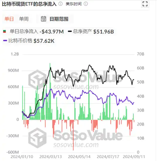 2021 年的牛市周期以及 2024 年年初美 SEC 通过了比特币现货 ETF,同样给加密市场带来相当高的活跃热度。截止 9 月 11 日数据,BTC 现货 ETF 总净流入达到 170 亿美元。
