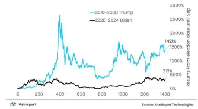 由此可见,从过去两轮周期的市场历史表现来看,不论是共和党还是民主党总统候选人上台,都并没有影响加密市场的向上走势。