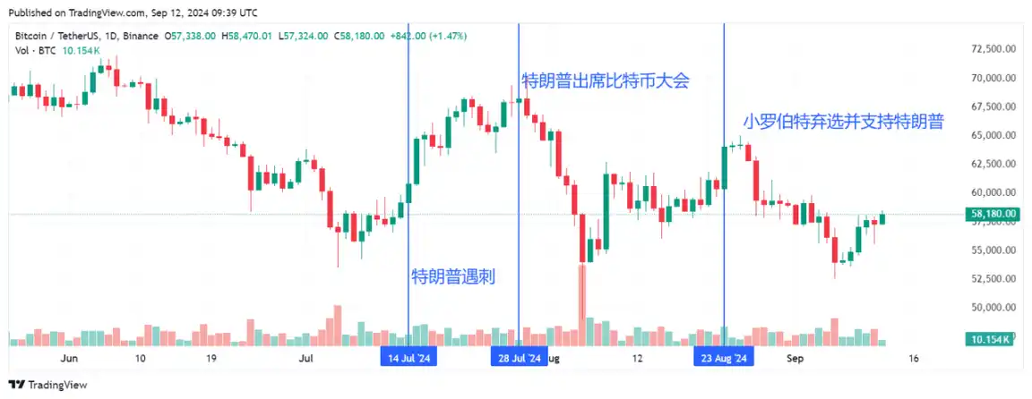 7 月 14 日上午,作为候选人的特朗普遭遇刺杀,当日 BTC 上涨 2%,突破 6 万美元关口,并在次日再次上涨 6%,升至 6.5 万美元附近,并在这之后震荡上扬。
