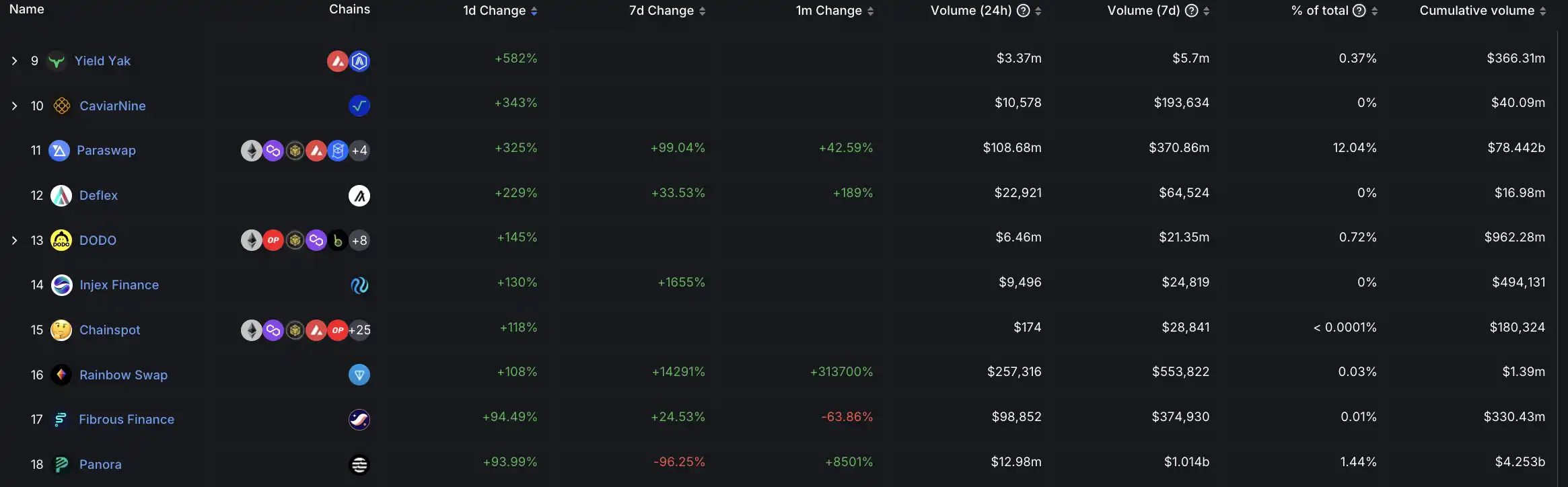 每日 DeFi 市场资金及交易量异动情况,按 DEX 聚合器及 Perp DEX 交易量及增长幅度筛选并排列