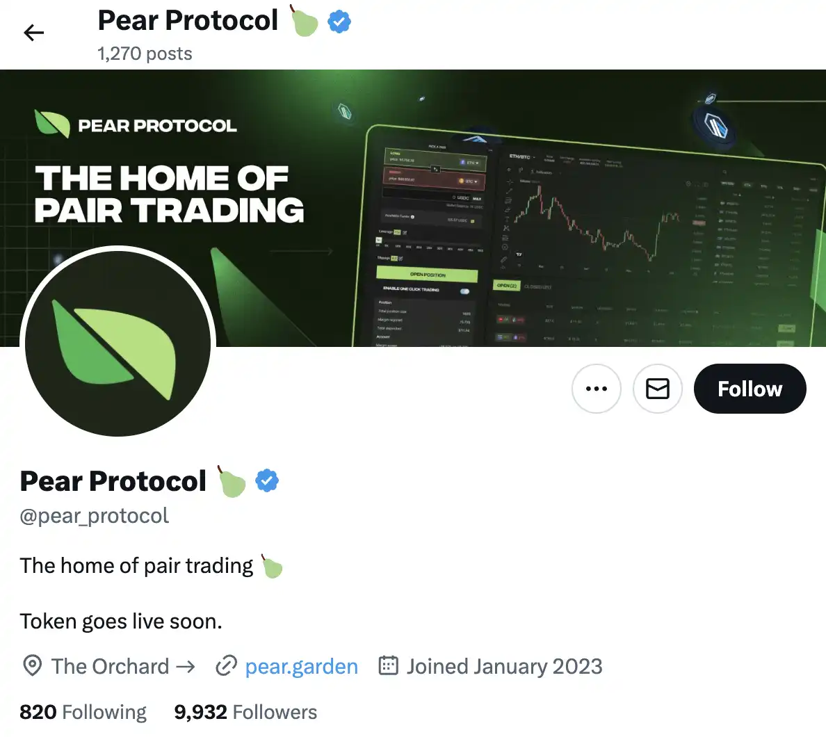 Pear Protocol 是 Arbitrum 上的策略合约 DEX,可以自由选择币种,使用 GMX 和 vertexprotocol 的流动性池。