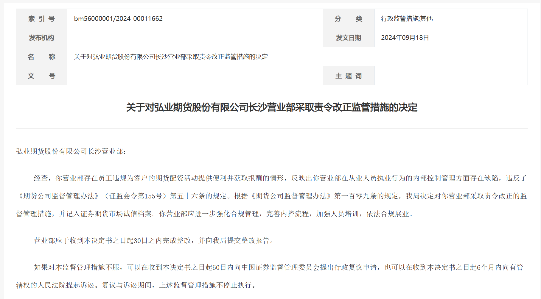 湖南证监局根据《期货公司监督管理办法》**百零九条的规定,决定对弘业期货长沙营业部采取责令改正的监督管理措施,并记入证券期货市场诚信档案。湖南证监局要求,该营业部应进一步强化合规管理,完善内控流程,加强人员培训,依法合规展业。应于收到本决定书之日起30日之内完成整改,并向其提交整改报告。