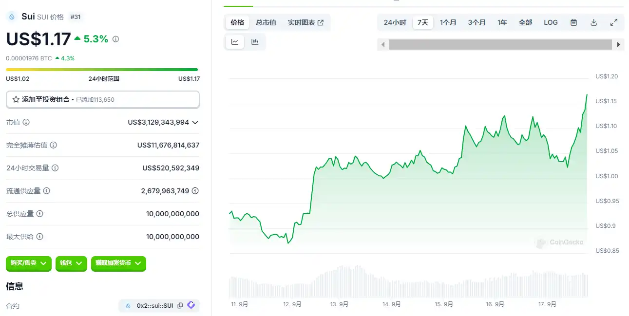 根据 CoinGecko 数据,SUI ** 1.17 美元,过去 24 小时交易量达 5 亿美元,23 小时涨幅达 2.3%,过去 7 天涨幅高达 28%,在市值 Top30 中**涨幅排名**。相关阅读:《SUI 领涨加密市场:DeFi 生态爆发、灰度信托加持,价格还能飙升几倍?》