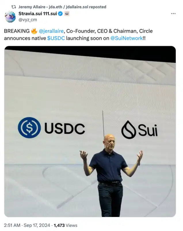 Circle **执行官 Jeremy Allaire 宣布即将在 Sui 网络上推出 USDC,将稳定币的支持范围扩大到 15 个区块链网络之外。Allaire 于 9 月 17 日在 X 上转发了 Sui 网络大使 Stravia.sui111.sui 的公告。