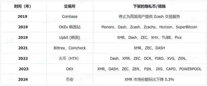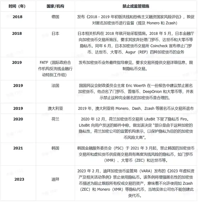 一个**并不具有犯罪属性,但它的确为犯罪开了便利之门,受到监管重锤也是理所当然。下表揭示的则是近些年由于合规等各方面原因下架的隐私币以及各国监管要求。