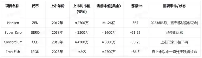 上述三个项目为当前隐私币板块 TOP3 的项目,隐私币是在加密货币中增加隐私属性的早期尝试,虽然均较上市有较大增幅,但整体离**跌幅较深,很难再回高峰。