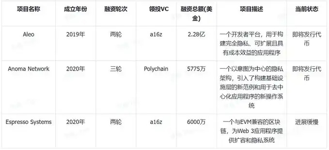 相较于早期已上市的 Layer1 隐私协议,后续未上市的项目展现出了更高的潜力,特别是**投资机构的参与,给予了高额的融资,以支持项目持续开发运营,但主要缺点也是普遍开发周期长。
