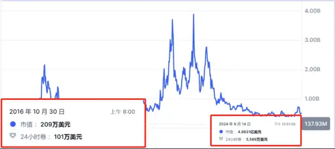 其**于 2016 年 10 月发行,市值从早期的 209 万美金增长到如今约 5 亿美金,涨幅约达 240 倍,但较其**已跌去 90%。