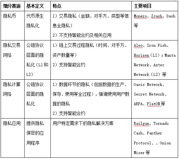 隐私赛道大致可分为隐私币、隐私交易网络、隐私计算网络、隐私应用这四大板块,细分赛道主要特点如下表: