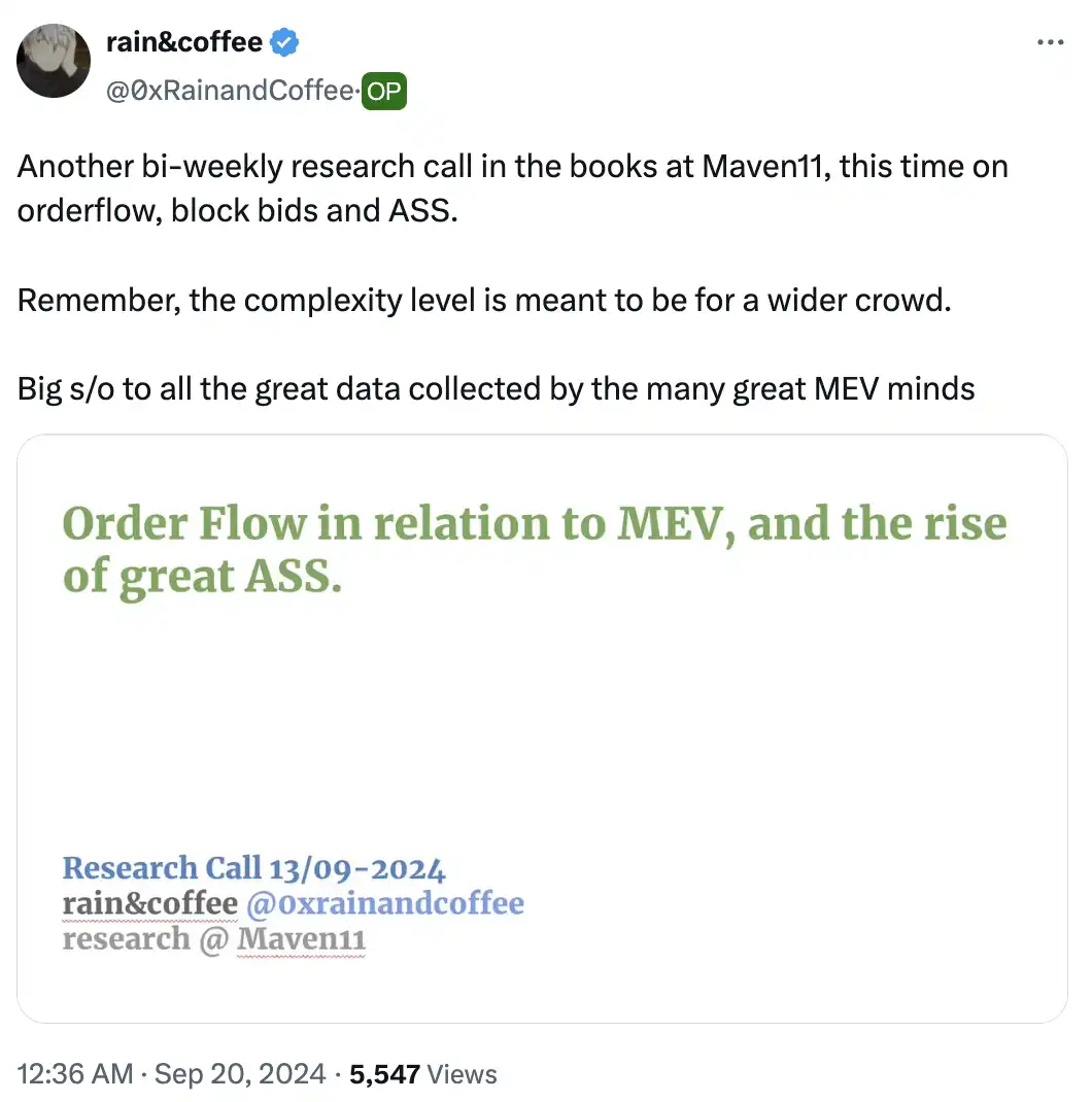 1.Maven11 中的双周研究电话会议,关于订单流、集体出价和 ASS。@0xRainandCoffee