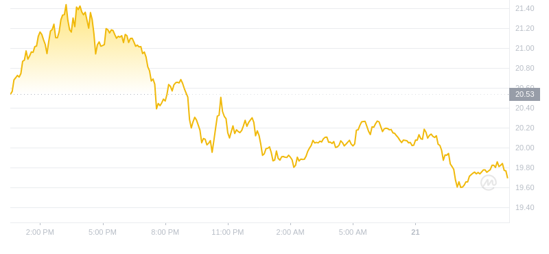 截至 2024 年 9 月 21 日午夜,Arweave (AR) 的价格为 19.68 美元。过去 24 小时的交易量为 5735 万美元。 AR 在此期间下跌了 4.075%。