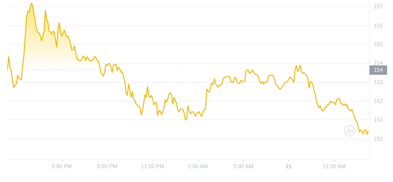 截至 2024 年 9 月 21 日 13:00,Aave (**VE) 的价格为 150.43 美元,过去 24 小时内交易量为 1.707 亿美元。