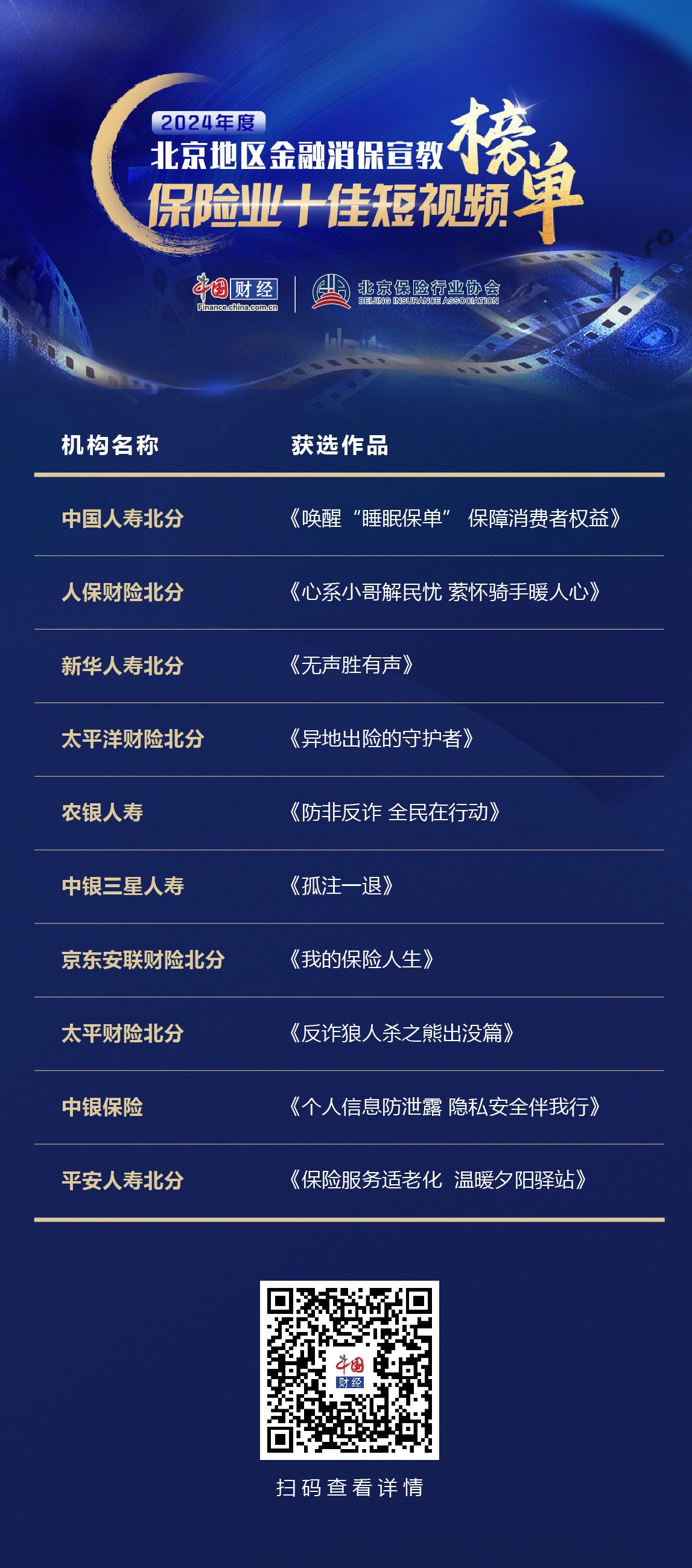 “2024年度北京地区金融消保宣教保险业十佳短视频”名单:**人寿北分《唤醒“睡眠保单” 保障消费者权益》、人保财险北分《心系小哥解民忧 萦怀骑手暖人心》、新华人寿北分《无声胜有声》、太平洋财险北分《异地出险的守护者》、农银人寿《防非** 全民在行动》、中银三星人寿《孤注一退》、京东安联财险北分《我的保险人生》、太平财险北分《**狼人杀之熊出没篇》、中银保险《个人信息防泄露 隐私安全伴我行》、平安人寿北分《保险服务适老化 温暖夕阳驿站》。