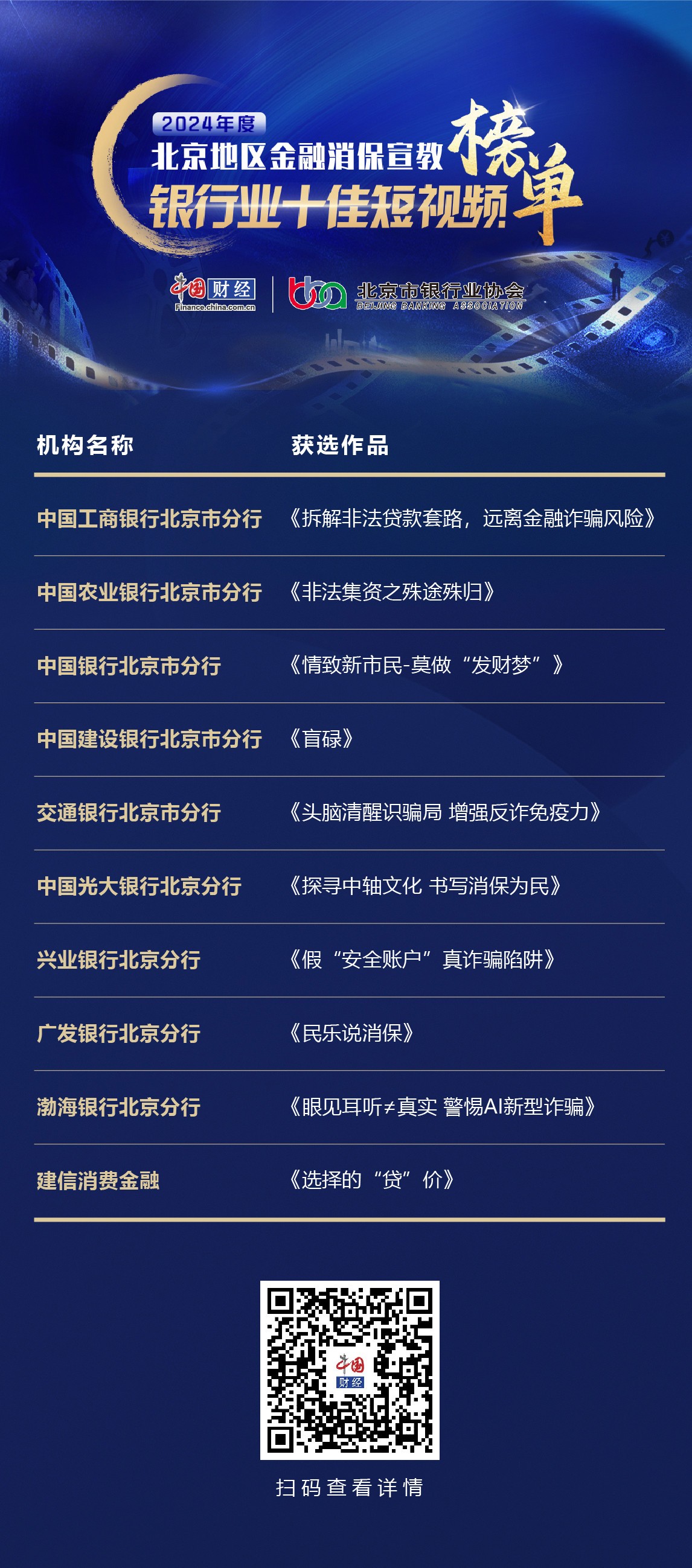 “2024年度北京地区金融消保宣教银行业十佳短视频”名单:**工商银行北京市分行 《拆解非法**套路,远离金融**风险》、**农业银行北京市分行《非法集资之殊途殊归》、**银行北京市分行 《情致新市民-莫做“发财梦”》、**建设银行北京市分行 《盲碌》、交通银行北京市分行 《头脑清醒识** 增强**免疫力》、**光大银行北京分行 《探寻中轴文化 书写消保为民》、兴业银行北京分行 《假“安全账户”真**陷阱》、广发银行北京分行 《民乐说消保》、渤海银行北京分行 《眼见耳听≠真实 警惕AI新型**》、建信消费金融 《选择的“贷”价》。