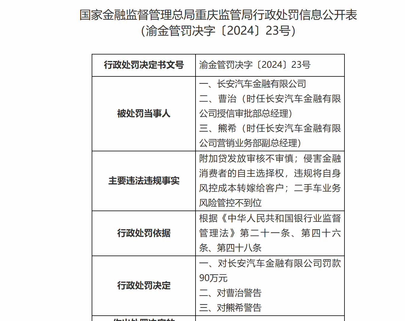 同时,重庆监管局分别对时任长安汽车金融授信审批部总经理曹治,时任长安汽车金融营销业务部副总经理熊希,予以警告。