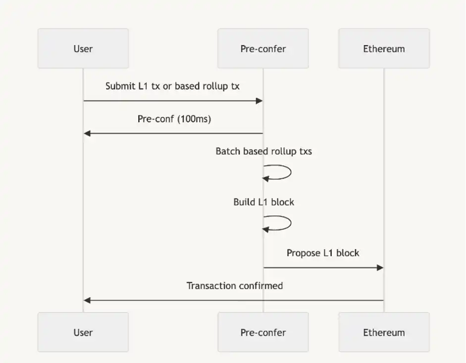 简言之,在 Based Rollup 中,预确认就是在交易被正式提交到 L1 进行确认之前,就承诺将交易包含在区块中,等于先给用户一个初步的确认信号,让用户知晓交易已经被接受并且正在处理中。