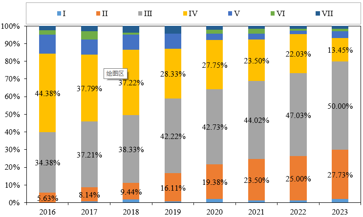 图2展示了2016-2023年**保险机构治理**的分布情况,可见治理**为II和III的样本占比逐年扩大,治理**为IV、V、VI和VII的样本整体占比逐年缩小,说明近年来我国保险机构的治理**出现整体性的提升。