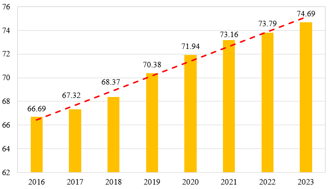 评价结果显示,2016-2023年**保险机构治理总指数样本平均值依次为66.69、67.32、68.37、70.38、71.94、73.16、73.79和74.69。**保险机构治理指数自2016年起呈现稳步上升态势,由最初的66.69逐步攀升至2023年的74.69,上升幅度达8.0,表明我国保险机构整体治理水平持续提升。