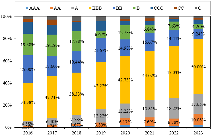 图3展示了2016-2023年**保险机构治理评级的分布情况,可见近年来治理评级偏中高的例如**、A和BBB级的保险机构样本占比越来越高,而治理评级偏低的尤其是C类的保险机构样本占比逐渐缩小。