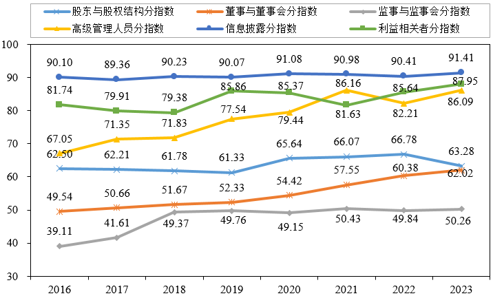 基于治理内容视角,**保险机构治理指数(CIIGI由股东与股权结构、董事与董事会、监事与监事会、**管理人员、信息披露和利益相关者六个内容维度分指数构成。据2016-2023年**保险机构治理分指数评价结果,如图4所示,我国保险机构六大治理内容维度治理水平均呈现上升趋势,其中,信息披露水平优异,监事与监事会形成治理洼地,我国保险机构利益相关者、**管理人员以及董事与董事会治理状况优化趋势显著,股东与股权结构治理状况相对平稳。