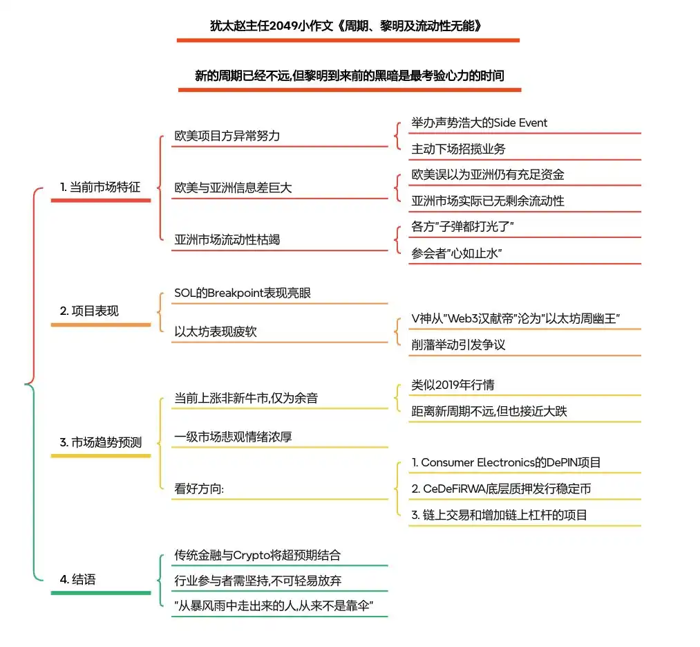 4. 亚洲市场的流动性无能也让今年中文区小作文如此难写,甚至在繁忙的一周之后,参会者说不出**的感受,因为不管是资方、项目方、KOL 还是散户,基本子弹都打光了,导致今年参会就像是太监逛窑子,心如止水,甚至有一些瞬间,竟然佛系到没有很想赚钱了。