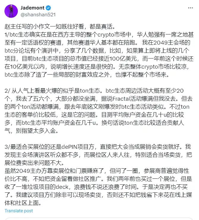 虽然 2049 主办方靠卖展位和门票赚麻了,但问了一圈,参展商普遍觉得性价比不高,不如把资金留着做社区推广。我们两年前也买过一个展位,但是收了一堆垃圾项目的 Deck,浪费钱不说还浪费了时间。于是决定再也不买了。我建议项目方们除非可以现场卖货,否则还不如把钱省下来花在线上媒体和社区上面。