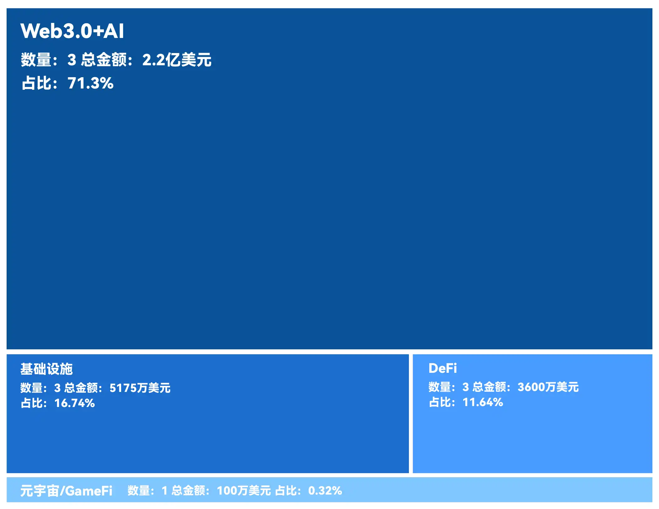 据 BlockBeats 统计,上周的融资总数为 10 笔,数量较之前持平,总金额约为 30920 万美元,平均融资金额为 3.92 万美元。其中,Web3 AI 占据主体,基础设施相对较多,元宇宙较少。下图为上周各板块融资占比: