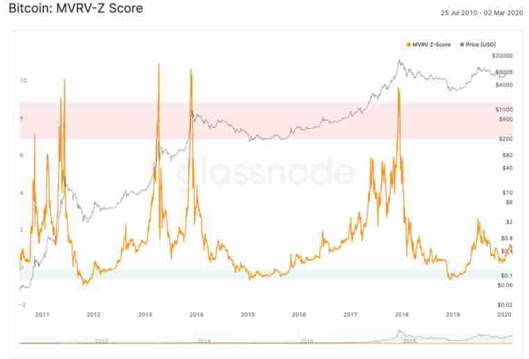 MVRV-Z 分数用于评估资产相对于其“公道价格”何时被高估或低估,就像是MVRV所强调的那样。 当市场价值显著高于实现价值时,它在历史上表明市场顶部(红**域),而相反表明市场底部(绿**域),我们可以在MVRV-Z分数这个指标中,很好地找到市场顶部和底部。