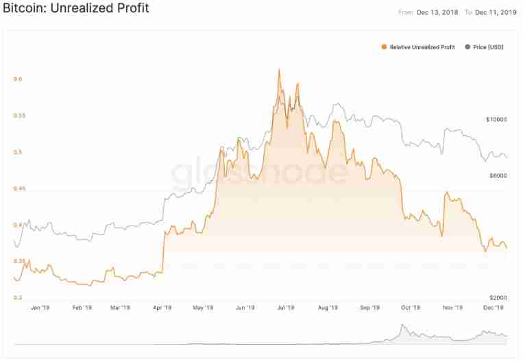 未实现利润定义由所有获利中的比特币部位(USD)按市值标准化。