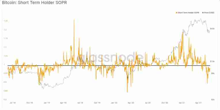 SOPR 值小于1 意味着当天移动的**平均在亏损的情况下出售(出售价格低于支付价格)。