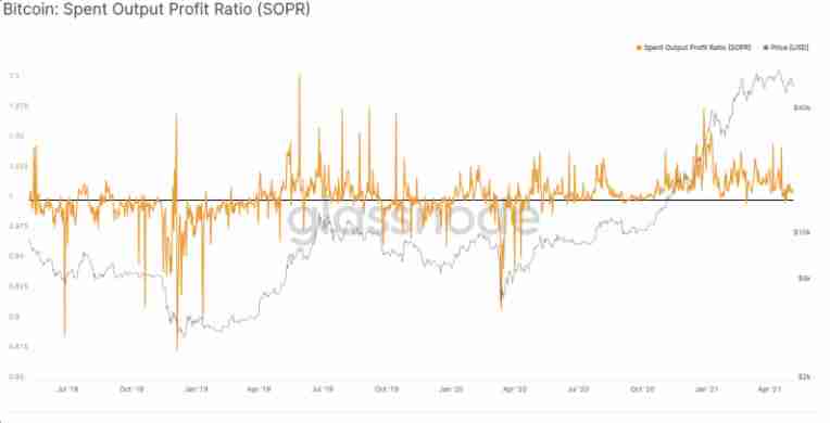 SOPR 值大于1 代表着当天移动的硬币平均在获利的情况下出售(出售的价格大于支付的价格)。