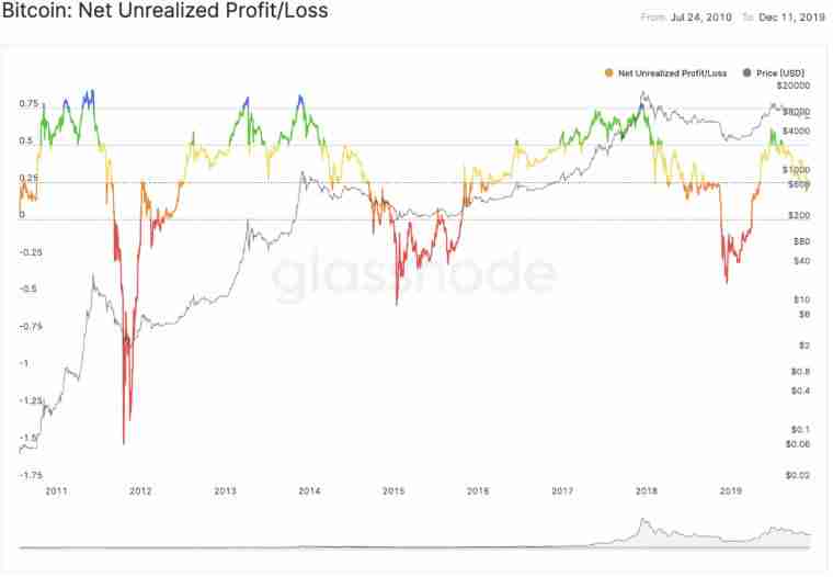 通过查看、创建UTXO时的价格与现价之间的差距,我们可以确定该UTXO中的比特币是处于未实现利润(价格上升),还是处于未实现损失(价格下降)的状态;在整体网路中查看这项指标时,我们可以看到整体而言有多少资产是获利,又有多少是处于亏损的。