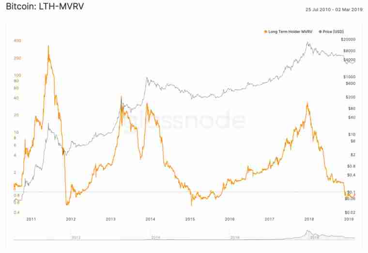 长期持有者-MVRV比率是只计算155(天或更久)的UTXO ,作为评估长期投资者(Long term holders)行为的指标的MVRV。