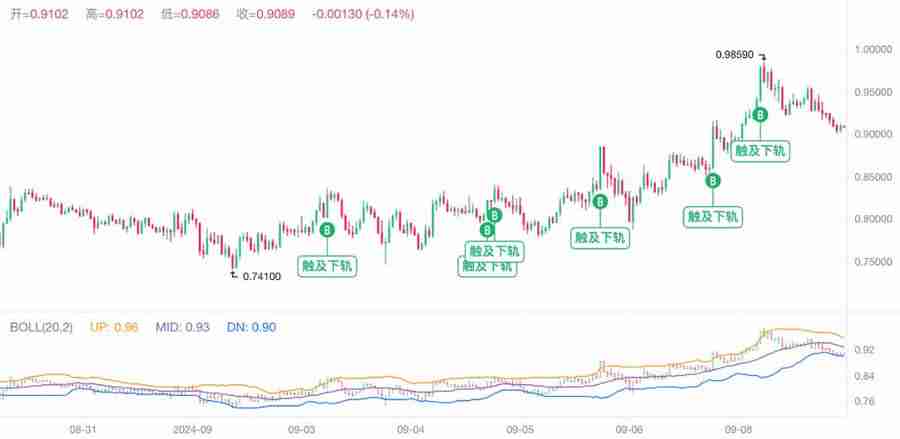 -入场条件:当SUI 价格跌破BOLL支撑价格$0.899时