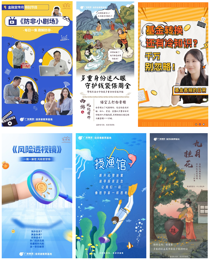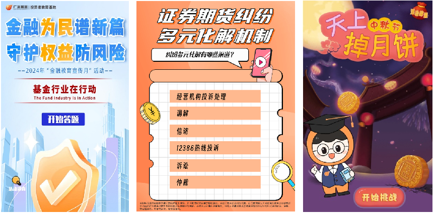 围绕本次活动主题,广发基金还开展了丰富多彩的线上活动。推出“金融教育宣传月”互动答题活动,引导投资者维护自身权益;在微信公众号、小红书、B站等多媒体平台上线纠纷多元化解宣传活动,引导投资者通过多元途径化解纠纷;开展防非**故事征集活动,引导投资者从经典故事中总结防非**启示;结合中秋节推出“天上掉月饼 谨防掉陷阱”防非主题小游戏,提升投资者的防非**意识。