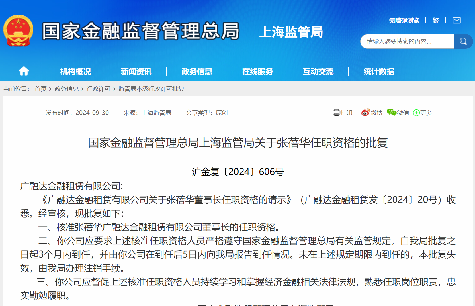 张蓓华获批担任广融达金租董事长 作者:LR •更新时间:2024-09-30 12:16:45•阅读 0 财经9月30日讯 今日,**金融监督管理总局上海监管局公布相关批复信息,核准张蓓华广融达金融租赁有限公司(简称:广融达金租董事长的任职**。以下是相关批复正文: