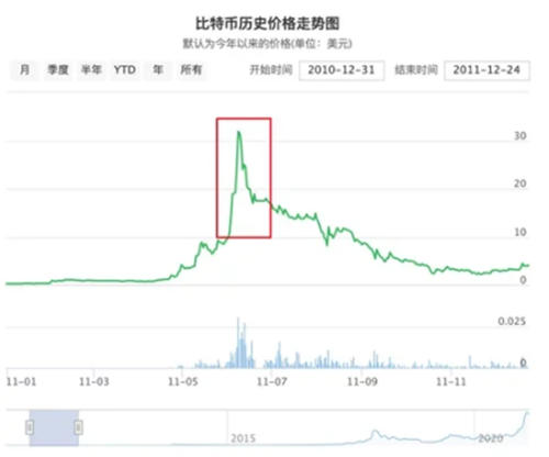 好景不长,Mt.Gox交易平台出现网络黑客袭击事件,加上那时候市场深度不够,几个卖盘下来,价格就难以支撑点,因此2011年6月到11月,BTC价格从高些32美元下跌至2美金,下滑达94%。虽然此次比特币的大幅度波动劝退了一部分人员,却也让广大认可它的价值的投资人看到了比特币的发展潜力,坚定再次项目投资坚定的信念。