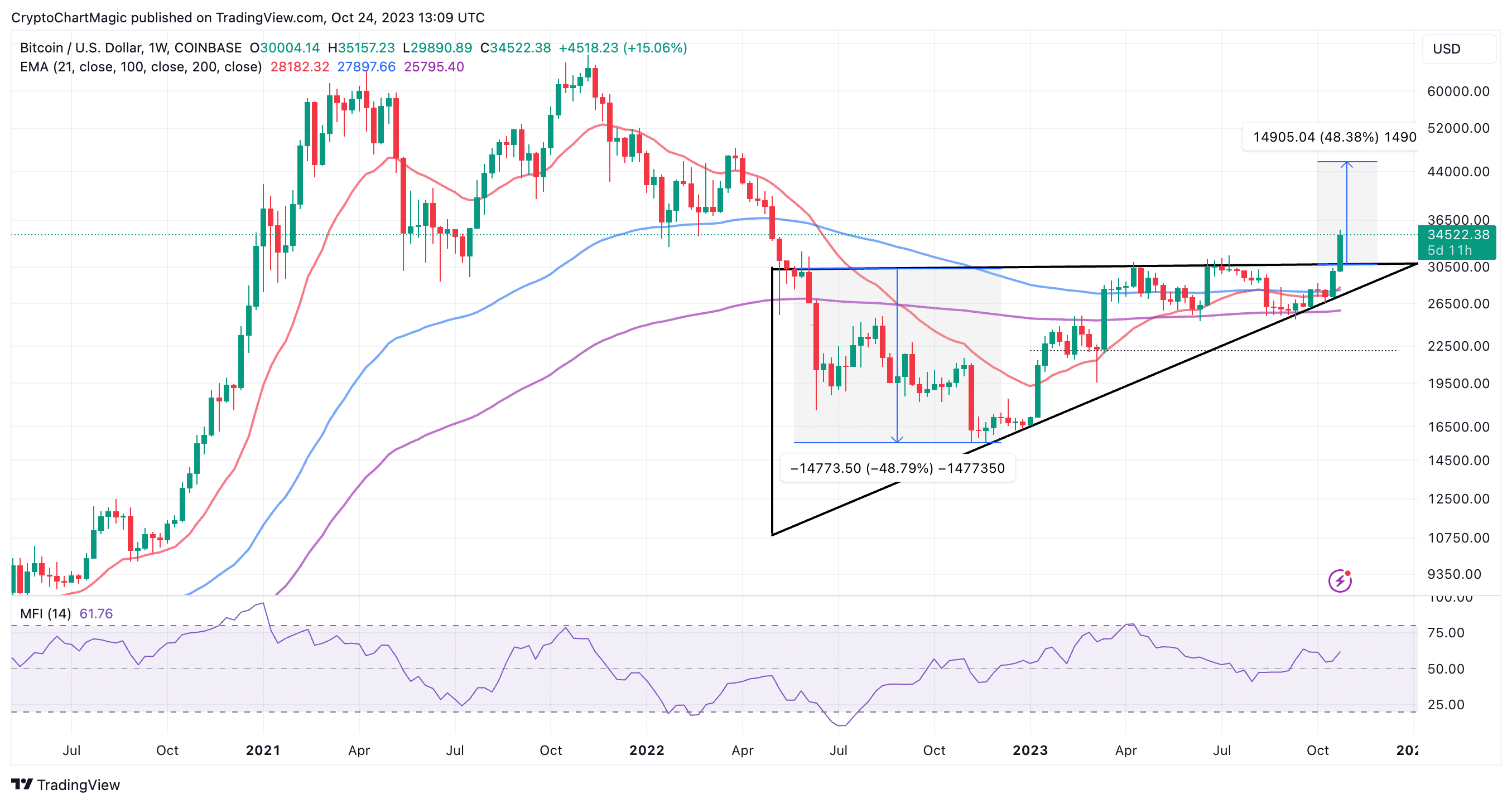 机构投资者正在不遗余力地竞相预订头寸并利用比特币价格的即兴上涨。围绕美国现货 BTC ETF 获批的乐观情绪可以被视为突破背后的主要力量之一——首先突破 30,000 美元,现在升至 35,000 美元。