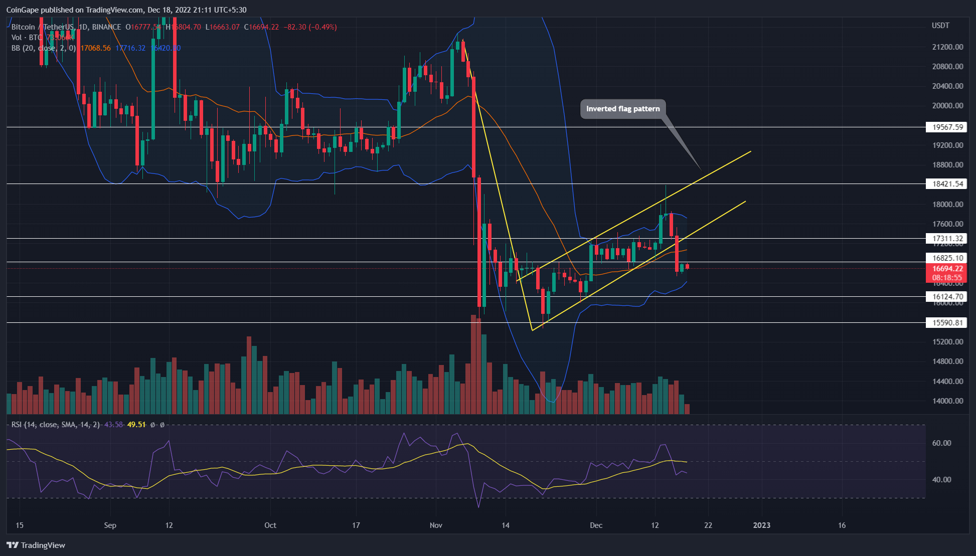 因此,在 12 月 16 日,一根长长的红色蜡烛刺穿了支撑趋势线,表明看跌势头得到补充。今天,BTC 价格下跌 0.5%,试图跟进支撑位的跌破。