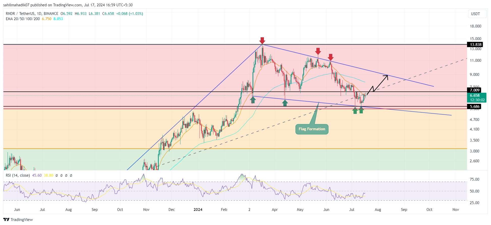 在 7 月初市场不确定的情况下,RDNR价格呈现出盘整趋势,寻求 5.68 美元的支撑。水平线与 23.6% 斐波那契回撤水平相吻合,表明 Render **在下一次飞跃之前有一个健康的回撤。